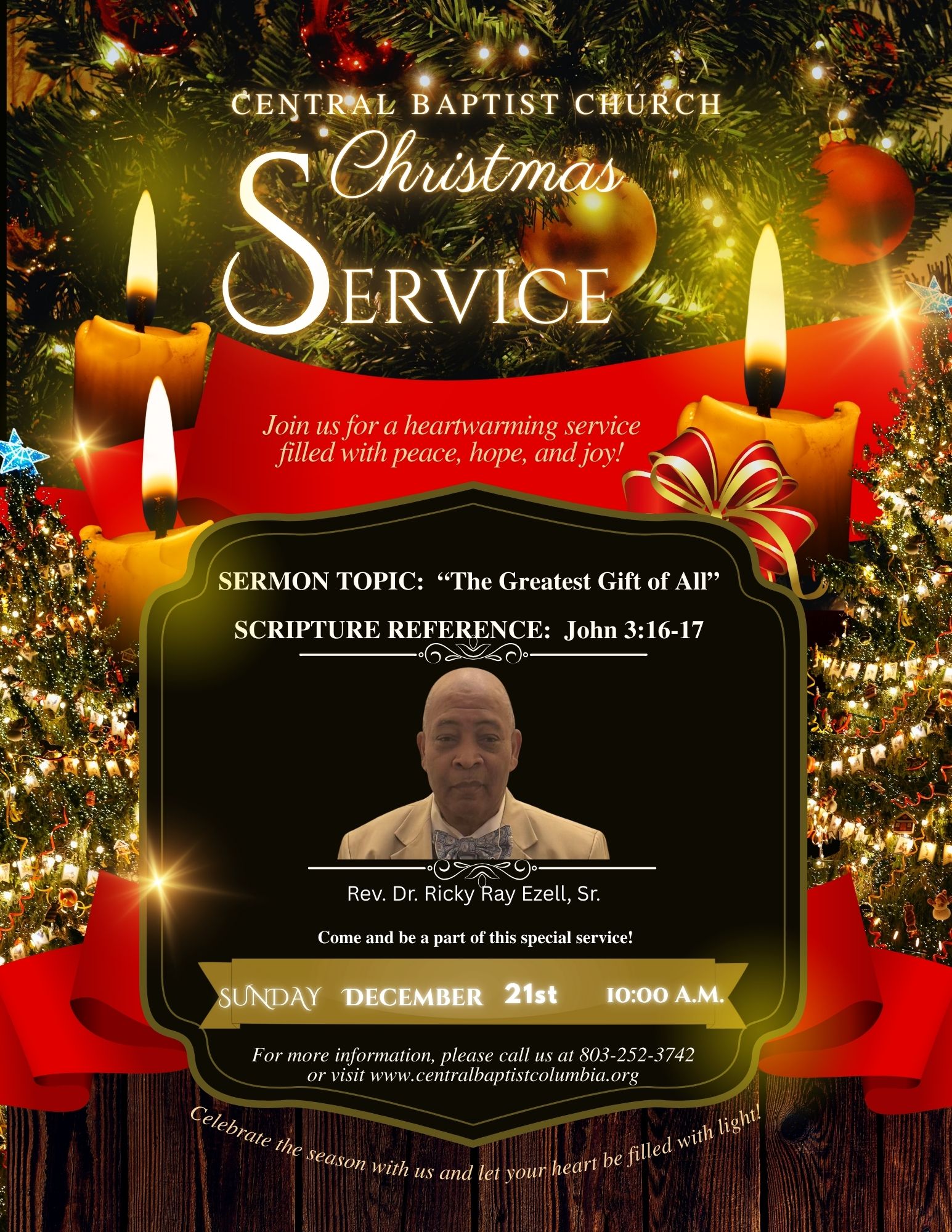 Please join us via Facebook, YouTube or Streaming Live @ www.centralbaptistcolumbia.org on Sunday, December 21, 2025 as Rev. Dr. Ricky Ray Ezell, Sr. preach from the Sermon Topic: “The Greatest Gift of All” – Scripture Reference: John 3:16-17. You can also go to our website under donations to pay tithes and offerings or to make a spiritual donation and/or contributions. We can be reached at 803-252-3742 / 3625 Clement Road-Columbia, SC 29203 / [email protected].